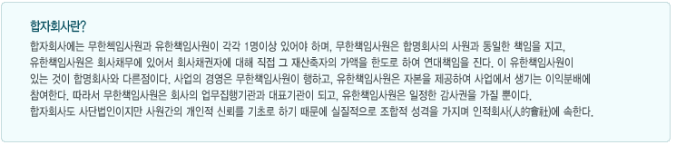 ÇÕÀÚȸ»çÀÇ ¼³¸³Àº °¢°¢ 1¸í ÀÌ»óÀÇ ¹«ÇÑÃ¥ÀÓ»ç¿øÀÌ µÉ »ç¶÷°ú À¯ÇÑÃ¥ÀÓ»ç¿øÀÌ µÉ »ç¶÷ÀÌ Á¤°üÀ» ÀÛ¼ºÇÏ¿© ¼³¸³µî±â¸¦ ÇÔÀ¸·Î½á ¿Ï·áÇÑ´Ù. ÀÌ Á¤°ü°ú ¼³¸³µî±â¿¡´Â ÇÕ¸íȸ»ç¿¡¼ ¿ä±¸µÇ´Â »çÇ× À̿ܿ¡ °¢ »ç¿øÀÇ Ã¥ÀÓÀÇ À¯ÇÑ·¹«ÇÑÀ» ¸í½ÃÇØ¾ß ÇÑ´Ù. ´Ù¸¸ µî±â»çÇ×ÀÇ °ø°í¿¡´Â À¯ÇÑÃ¥ÀÓ»ç¿øÀÇ ¼ö¿Í ÃâÀÚÃѾ׸¸À» ±â·ÏÇÏ¸é µÈ´Ù. 1. ÀýÂ÷ 2. »çÀü È®ÀλçÇ× 3. ¼³¸³½Ã ÇÊ¿äÇÑ ¼·ù 4. ¼Ò¿ä±â°£ |